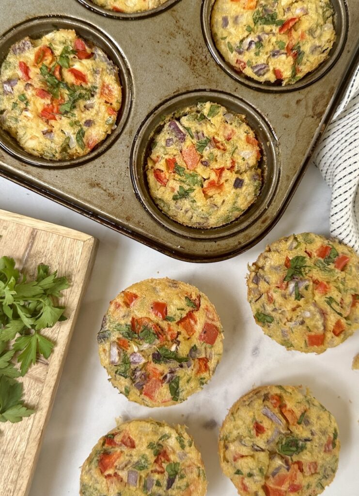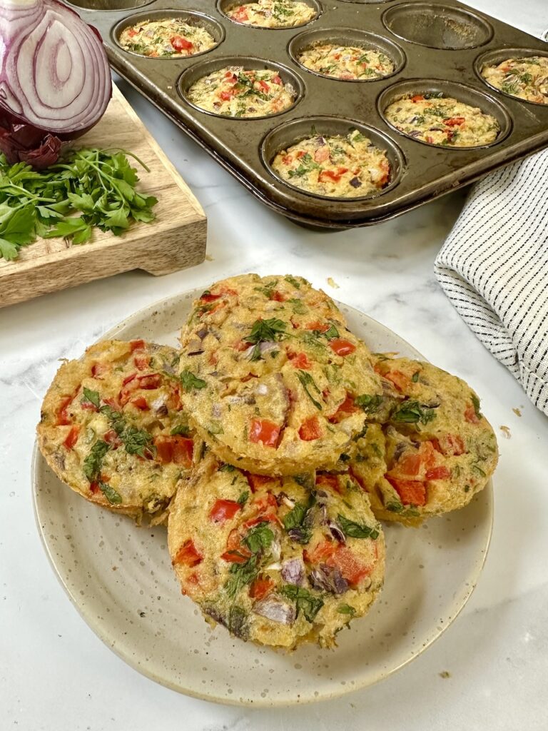 Here’s an easy meal prep or lunch box idea. These egg-free mini frittatas are full of veggies and made with gram (chickpea) flour, which is not only gluten free but highly nutritious.