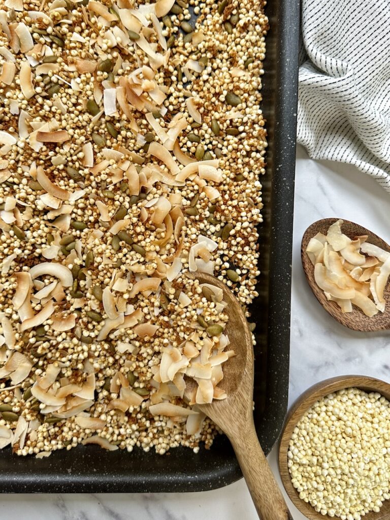 This recipe stands out because it’s free from oats, which are commonly used in granola. I know a lot of you tell me that if you have gluten sensitivities or intolerances, even certified gluten-free oats can be problematic for you. So hopefully this can be one you can try.