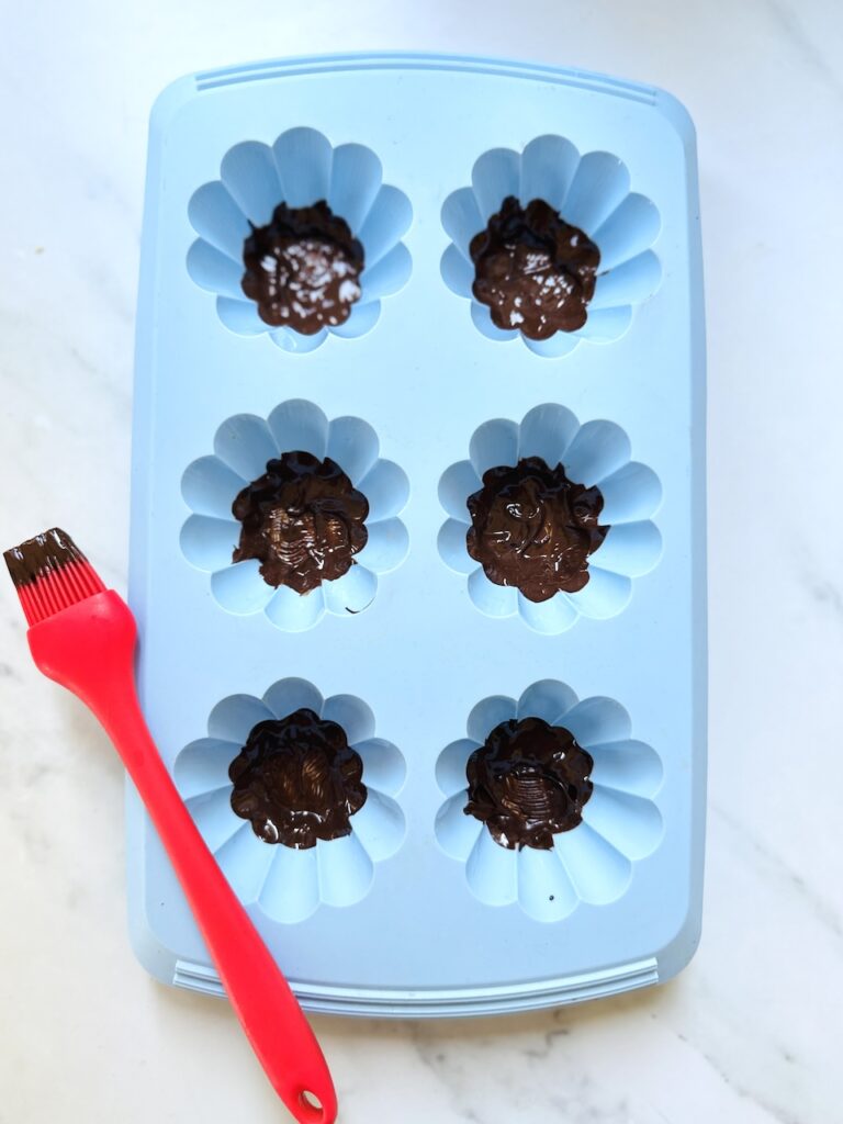 - Melt the chocolate and add a spoonful to the bottom of each silicone cupcake tray (or cupcake cases). Use the back of a spoon to push up the sides slightly. Refrigerate to harden for a couple of minutes. Set the rest of the chocolate aside.