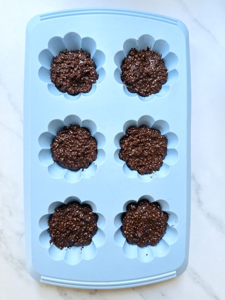 - Add a spoonful of the chocolate mix to the top of each one and spread out to cover the top of the peanut butter.