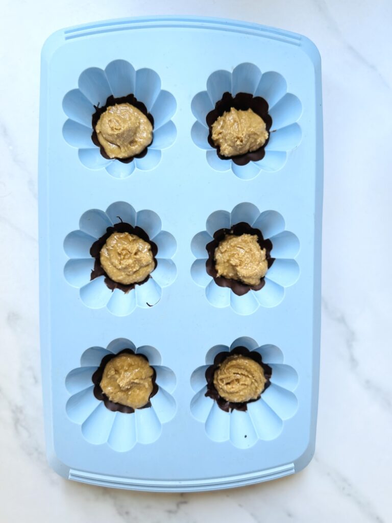 - Mix the peanut butter with the almond flour and add a spoonful into the centre of each cup.