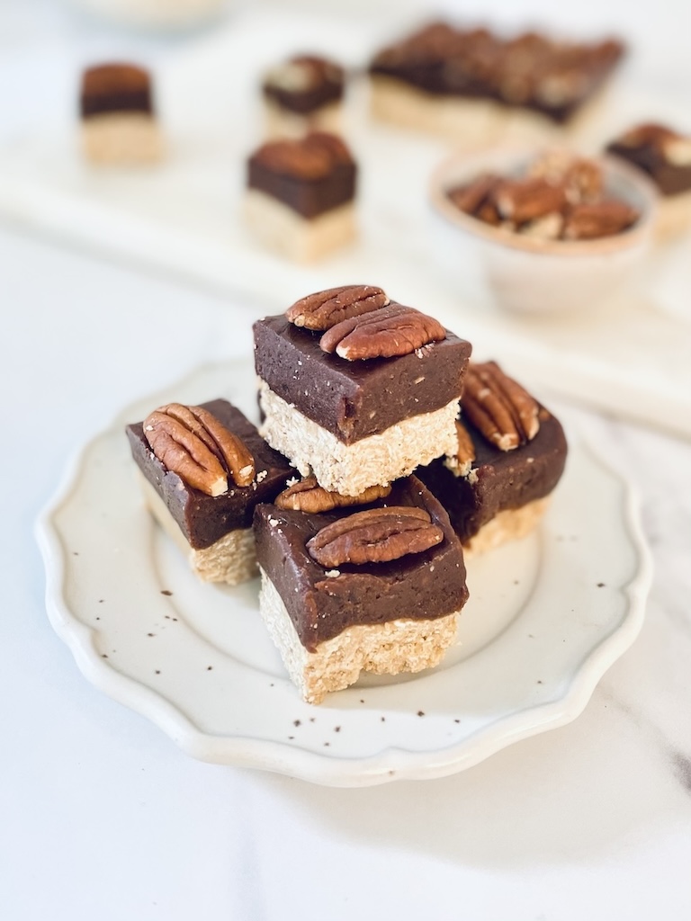 - To make the topping, add the pitted dates and pecans to a food processor and blend until smooth. If your dates are a bit dry add 1-2 tbsp of water as you blend. Once fully combined, spread on top of the base and top with extra pecans. Refrigerate to set for at least an hour.
