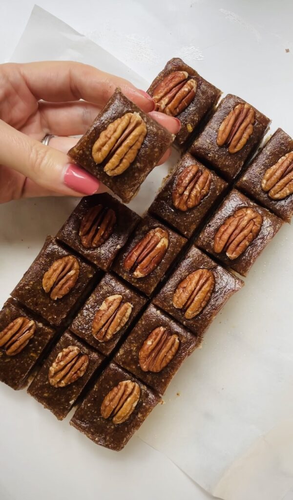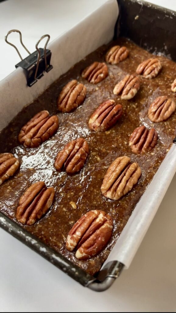 I make it in a loaf tin and it’s then easy to cut into 15 small squares, with a pecan half on top of each one. Obviously if you would prefer a larger portion, you can also cut these into slightly bigger bars.