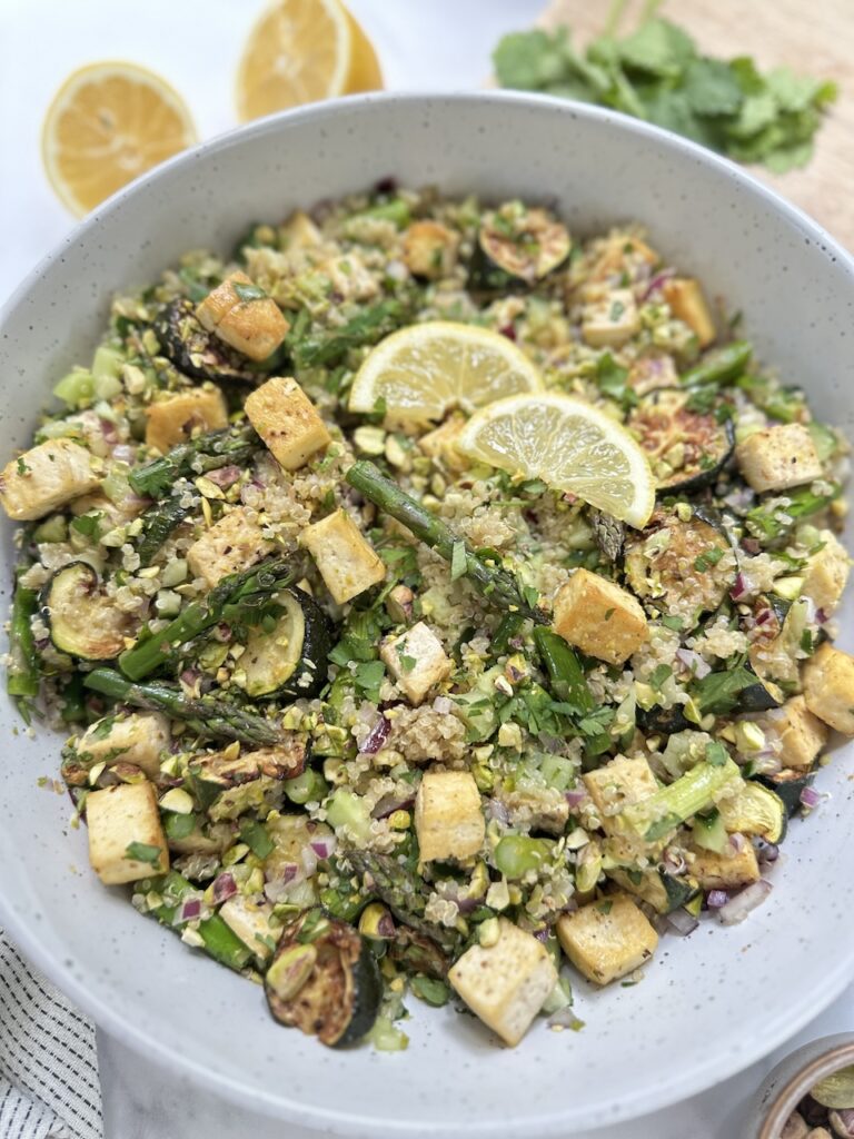 It’s definitely salad weather and when it’s hot I want food that’s on the table quickly. And this Pistachio and Lemon Herby Quinoa is a great one to add to your summer salad list.