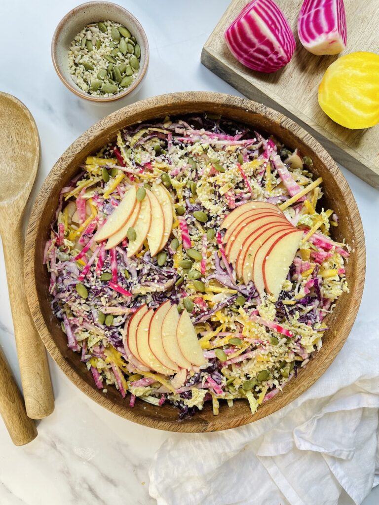 It’s full of glorious autumn vegetables but full of vibrant summer colour! I’ve used two types of cabbage (red and white) as well as two types of colourful beetroot (pink choggia and golden). Combined with apples and seeds to give maximum colour, flavour and nutrition.