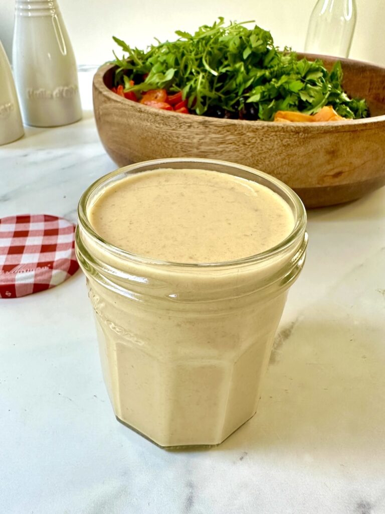 Made from ground sesame seeds, tahini is a good source of healthy fats, protein, and essential minerals such as magnesium, calcium, and zinc. It gives a lovely creaminess to the dressing without the need for dairy.