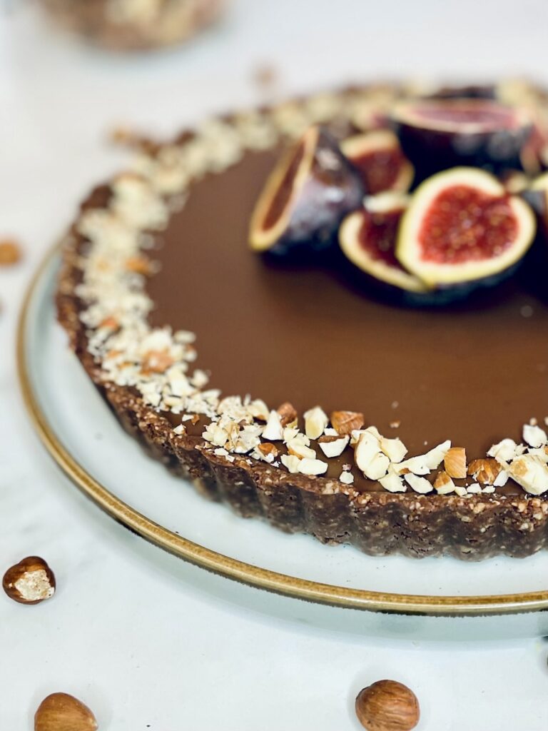 This vegan chocolate tart is a great option for dinner parties or when you are feeding a crowd. It’s great for Christmas or Easter too – just keep the base and ganache the same and change the toppings to suit the season.